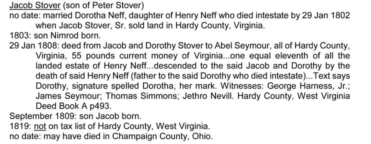 | STOVER REGISTER 10 GENERATIONS NOTE: These early generations cannot be certain yet. This chart below lists it with the latest information I have so far. If more information surfaces, this can change. Generation: 1. 1. Christian Stauffer (of Franklin Co PA) Stover died Bef 1805, Franklin County, Pennsylvania. Christian married Franey Bef 1768. Franey died Bef 1823, Franklin County, Pennsylvania. [Group Sheet] Children: 2. John (oldest son) Stover Descendancy chart to this point was born Abt 1768, Pennsylvania. 3. Christian (3rd son) (of Lower Milford) Stover Descendancy chart to this point was born Abt 1772, Pennsylvania; died Abt 1823, Lower Milford, Bucks County, Pennsylvania. 4. Daniel (4th son) Stover Descendancy chart to this point was born Abt 1774, Pennsylvania. 5. Jacob (2nd son) (of Hardy Co VA) Sr Stover Descendancy chart to this point was born Abt 1774, Virginia; died , Virginia. 6. Joseph Stover Descendancy chart to this point was born Abt 1775, Pennsylvania. 7. Franey (m. Beam) Stover Descendancy chart to this point was born 1776, Pennsylvania; died 1857, Franklin County, Pennsylvania. 8. Nancy (m. Hoover) Stover Descendancy chart to this point was born Abt 1776, Pennsylvania. 9. Elizabeth (m. Huffer) Stover Descendancy chart to this point was born 28 Nov 1778, Pennsylvania; died 18 Jun 1850, Cearfoss, Washington County, Maryland. Generation: 2 2. John (oldest son) Stover Descendancy chart to this point (1.Christian1) was born Abt 1768, Pennsylvania. 3. Christian (3rd son) (of Lower Milford) Stover Descendancy chart to this point (1.Christian1) was born Abt 1772, Pennsylvania; died Abt 1823, Lower Milford, Bucks County, Pennsylvania. Christian — Catharine. Catharine was born , Bucks County, Pennsylvania. [Group Sheet] Children: 10. Anna Stover Descendancy chart to this point was born , Bucks County, Pennsylvania. 11. David Stover Descendancy chart to this point was born , Bucks County, Pennsylvania. 12. Jacob Stover Descendancy chart to this point was born , Bucks County, Pennsylvania. 4. Daniel (4th son) Stover Descendancy chart to this point (1.Christian1) was born Abt 1774, Pennsylvania. 5. Jacob (2nd son) (of Hardy Co VA) Sr Stover Descendancy chart to this point (1.Christian1) was born Abt 1774, Virginia; died , Virginia. Jacob married Dorothy Neff Bef 1801, Virginia. Dorothy (daughter of Henry (of Hardy Co VA) Neff and Elizabeth) was born Abt 1777, Hampshire County, Virginia; died Bef 1816. [Group Sheet] Children: 13. David Stover Descendancy chart to this point 14. Benjamin Stover Descendancy chart to this point was born Abt 1794, Virginia. 15. Nimrod Sr of (Gilmer Co WV) Stover Descendancy chart to this point was born 1803, Hardy County, Virginia; died Feb 1880, Gilmer County, West Virginia; was buried Feb 1880, Normantown, Gilmer County, West Virginia. 16. Jacob (of Fayette Co OH) Jr Stover Descendancy chart to this point was born Sep 1809, Virginia; died 23 Dec 1875, Fayette County, Ohio; was buried Dec 1875, Union Township, Fayette County, Ohio. 6. Joseph Stover Descendancy chart to this point (1.Christian1) was born Abt 1775, Pennsylvania. 7. Franey (m. Beam) Stover Descendancy chart to this point (1.Christian1) was born 1776, Pennsylvania; died 1857, Franklin County, Pennsylvania. Franey — John Beam. John was born Abt 1770. [Group Sheet] 8. Nancy (m. Hoover) Stover Descendancy chart to this point (1.Christian1) was born Abt 1776, Pennsylvania. Nancy — Daniel Hoover. Daniel was born Abt 1770. [Group Sheet] 9. Elizabeth (m. Huffer) Stover Descendancy chart to this point (1.Christian1) was born 28 Nov 1778, Pennsylvania; died 18 Jun 1850, Cearfoss, Washington County, Maryland. Elizabeth — Michael Huffer Hoffer. Michael was born 7 June 1768, Franklin County, Pennsylvania; died 22 Nov 1824, Washington County, Maryland. [Group Sheet] Generation: 3 10. Anna Stover Descendancy chart to this point (3.Christian2, 1.Christian1) was born , Bucks County, Pennsylvania. 11. David Stover Descendancy chart to this point (3.Christian2, 1.Christian1) was born , Bucks County, Pennsylvania. 12. Jacob Stover Descendancy chart to this point (3.Christian2, 1.Christian1) was born , Bucks County, Pennsylvania. 13. David Stover Descendancy chart to this point (5.Jacob2, 1.Christian1) 14. Benjamin Stover Descendancy chart to this point (5.Jacob2, 1.Christian1) was born Abt 1794, Virginia. 15. Nimrod Sr of (Gilmer Co WV) Stover Descendancy chart to this point (5.Jacob2, 1.Christian1) was born 1803, Hardy County, Virginia; died Feb 1880, Gilmer County, West Virginia; was buried Feb 1880, Normantown, Gilmer County, West Virginia. Nimrod married Nancy Tevebaugh 31 Aug 1823, Allegany, Maryland, USA. Nancy (daughter of Daniel Jr. Tevebaugh and Martha "Patsy") was born Abt 1806; died 16 Feb 1838, Hardy County, West Virginia. [Group Sheet] Children: 17. George Stover Descendancy chart to this point was born 1829, West Virginia. 18. Catherine Stover Descendancy chart to this point was born 16 Aug 1831, Hardy County, West Virginia; died 21 Jul 1893, Gilmer County, West Virginia; was buried , Normantown, Gilmer County, West Virginia. 19. Jacob J Stover Descendancy chart to this point was born 20 Jul 1835, Randolph County, Virginia; died 19 Sep 1864, Winchester, Virginia, USA. 20. Job Stover Descendancy chart to this point was born 1837, Virginia; died 19 Sep 1864, Winchester, Winchester (Independent City), Virginia. 16. Jacob (of Fayette Co OH) Jr Stover Descendancy chart to this point (5.Jacob2, 1.Christian1) was born Sep 1809, Virginia; died 23 Dec 1875, Fayette County, Ohio; was buried Dec 1875, Union Township, Fayette County, Ohio. Jacob married Elizabeth "Betsy" Ann Powelson 15 Jan 1832, Virginia. Elizabeth (daughter of Charles (of Hampshire VA) Powelson and Anne Alexander) was born 10 Oct 1816, Romney, Hampshire County, Virginia; died 19 May 1864, Fayette County, Ohio; was buried May 1864, Fayette County, Ohio. [Group Sheet] Children: 21. William Henry Stover Descendancy chart to this 
