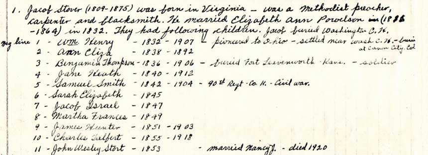 beginning with Christian Stauffer (died bef. 1805). Some of the information in this tree for the earliest generations has a bit more speculation. Not all of is is based on solid records. There are still questions about the accuracy of the Stovers in Generation 1 and 2, so as research continues and as more information is found, this info may evolve. Click on this page for more regarding brothers Nimrod Stover (1803-1880) and Jacob Stover (1809-1875). |