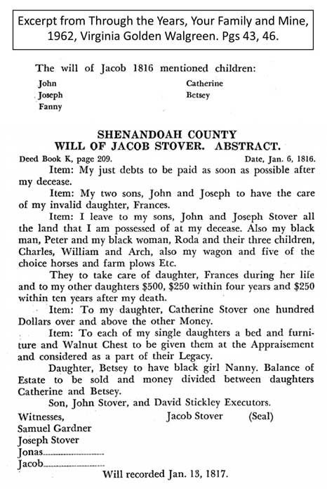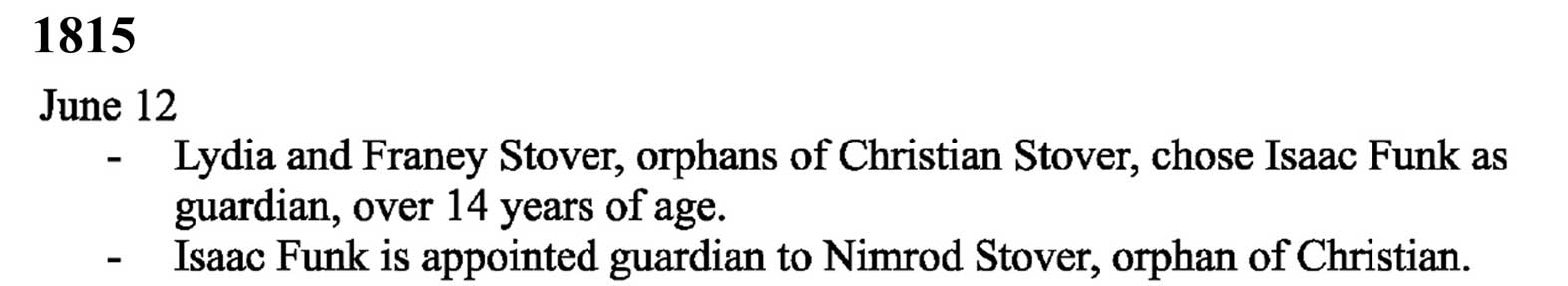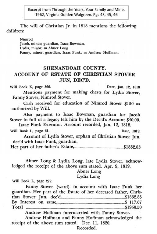 (1753-1816) and Dorothy Neff (1777-1816). ![]() Further information surfaced in 2020 within the hand-written Creamer-Stover-Watt document shown on this page. This document (part shown below) reinforced the information that Jacob and Nimrod were brothers in stating, "Jacob had one Brother named Nimrod." ![]() At first I concentrated on the Jacob Stover of Shenandoah County, Virginia below. I was conflicted about the parent connection because Jacob Stover's will made NO MENTION of children Nimrod or Jacob. I later concluded that this is NOT the correct Jacob I was looking for. ![]() The Christian Stover referred below is Christian Stover, Junior of Shenandoah County (1774-1815), who is the son of Christian Stover, Senior (abt 1750-1818), who is the BROTHER of the above Jacob Stover (1753-1816), who I originally thought to be the father of brothers Nimrod and Jacob. For a while I considered that Christian Stover, Junior (1774-1815) could be the father of brothers Nimrod and Jacob. If this was true, then Nimrod and Jacob would have also had two sisters, Lydia and Fanny Stover. All of these people appeared to have been orphaned when their father died in 1815. The documents shown below are related to the death and estate of Christian Stover, Junior (1774-1815). and to the guardianship of his minor children. This is a transcript of an 1815 Shenandoah County Minute Order. ![]() This excerpt is from the following source: http://www.seekingmyroots.com/members/files/G002218.pdf ![]() As you can clearly see, these documents show that there are brothers Nimrod and Jacob Stover who were minor children of Christian Stover (who died 1815). HOWEVER . . . I have since concluded this Nimrod and Jacob Stover is NOT the correct Nimrod and Jacob Stover that I am seeking. As it has turned out, this Nimrod Stover in the above documents died in 1823. The Nimrod Stover I'm seeking would have died in 1880 (there are good records for this). So the work continues. |